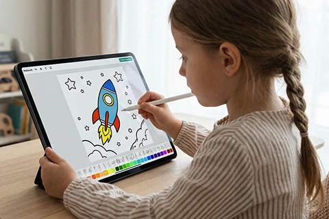 Choose from 30+ designs, open it in your browser and color it in with your finger or stylus – no app, no sign-up required.