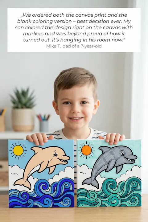 The blank coloring canvas is your chosen design printed as a black-and-white outline on a real canvas - no screen needed. Just color it in at home with markers and hang it up. Perfect for kids who love hands-on coloring.